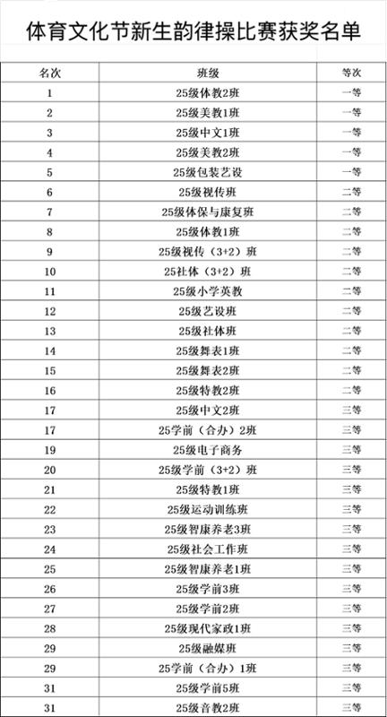 经过近一个小时的激烈角逐,评委们最终评选出了2025级体育教育2班等5个班级获得团体一等奖,2025级视觉传达设计班等11个班级获得团体二等奖,2025级中文2班等16个班级获得团体三等奖.