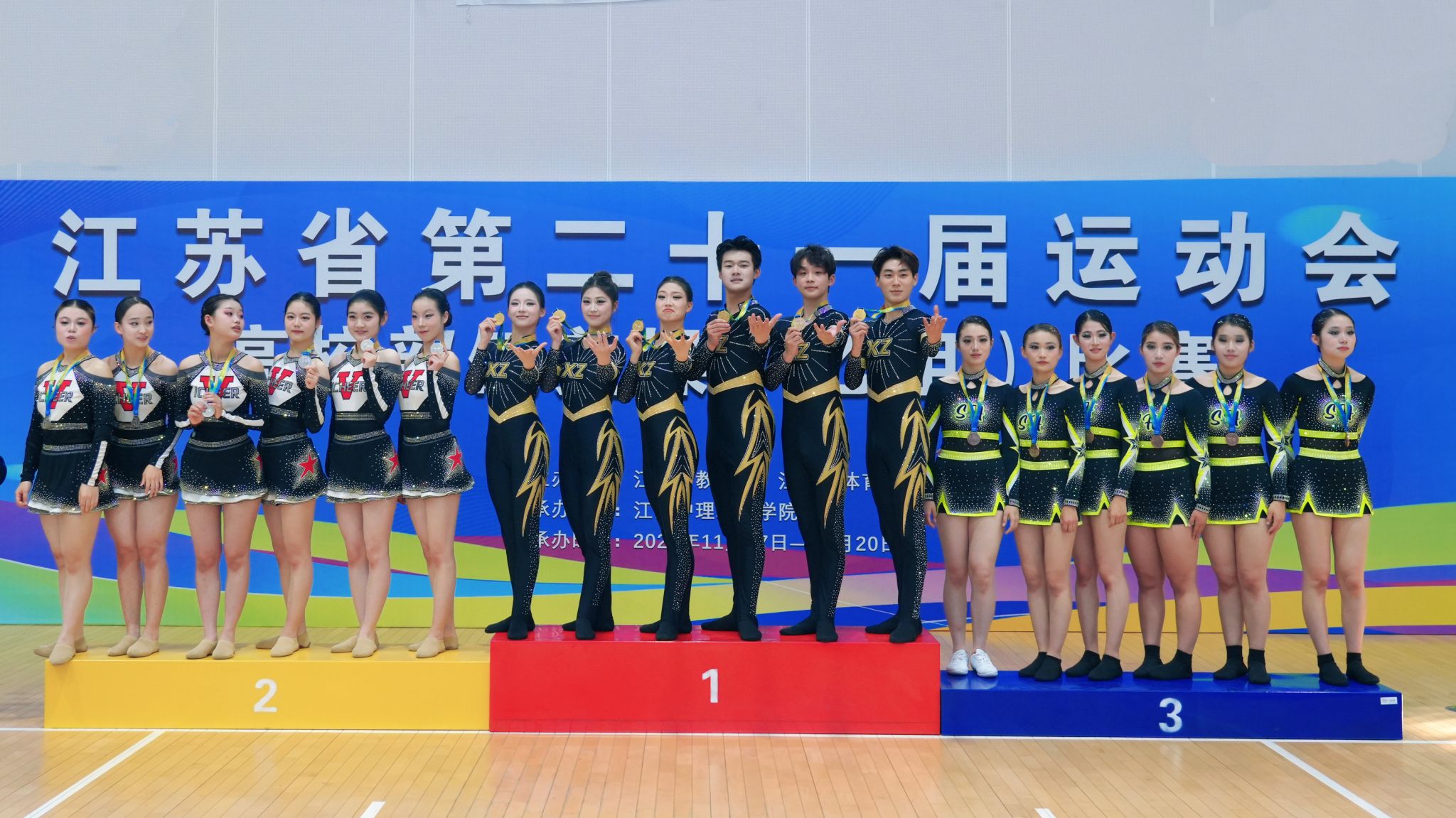 在刚刚落幕的江苏省第二十一届运动会高校部健美操(乙组)比赛中,我校啦啦操队凭借出色的表现,在竞争激烈的花球啦啦操项目中脱颖而出,勇夺第一名。