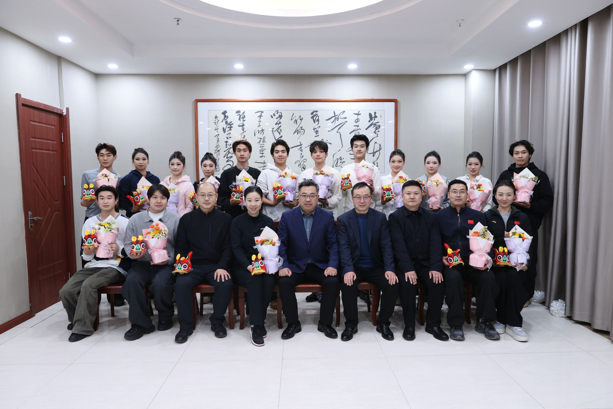载誉归来后,学校党委书记崔成前、副校长邓宪亮亲切慰问了凯旋的教练团队与啦啦操队员们,并向她们每人赠送了鲜花和寓意吉祥的“布老虎”,对她们取得的优异成绩表示热烈祝贺。崔书记充分肯定了教练团队和全体队员的辛勤付出与努力拼搏,并鼓励大家要将赛场上展现出的团结协作、勇于争先的体育精神,延续到今后的学习和生活中去,争取获得更加全面的发展。